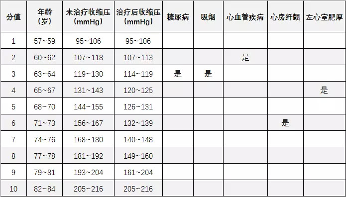 例如:一位70岁男性(5分),收缩压135 mmHg且正在服用降压药物(5分),无糖尿病病史(0分),无吸烟史(0分),既往曾有冠心病史(4分),无心房纤颤史(0分),无左心肥厚病史(0分),总分为14分,对应的10年卒中发病风险为17%。
