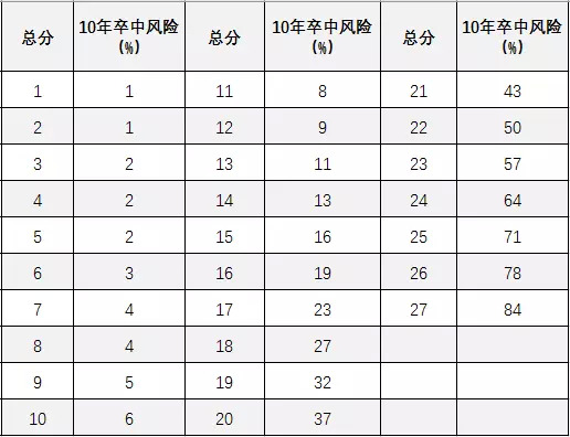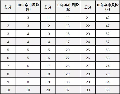 2011年美国卒中及预防指南建议对每个具有卒中风险的人使用风险评估量表(如改良的弗明汉卒中量表[1])进行卒中风险评估,能较好地预测未来10年卒中发病风险。