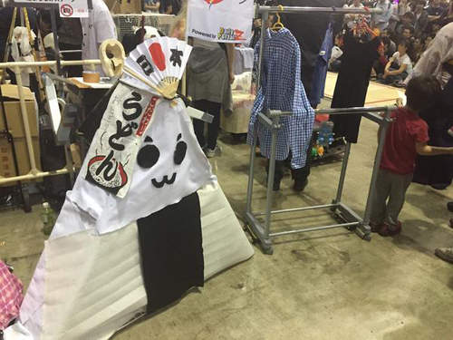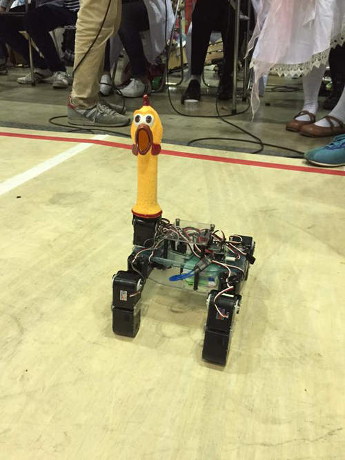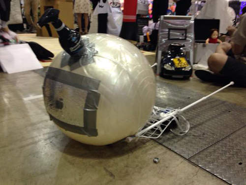 这样造型的机器人……听说是用垃圾组装而成的。虽然应该不用别人出马自己就咕噜噜滚到场外了,但还是要给这名选手的勇(lu)气(mang)点个赞。