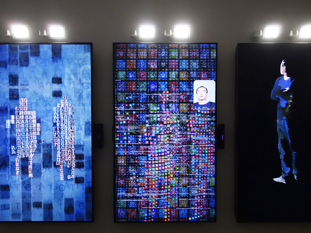 由彼得·魏博尔和贝恩特·林特曼共同创作的互动装置《You:R:Code》。贝恩特·林特曼是一位艺术家和科学家,他专门从事实时计算机图形学领域的工作,研究重点是交互系统和生成系统。该装置作品展现了在超人类时代,人类也会成为一堆代码以及数据的载体。装置有两种解读方式。第一种解读是“你的代码”,在欣赏该装置作品时,参观者会体验到不同类型的数字转换。第二种解读是“你是代码”,强调了我们本身也是由代码组成,这也最先体现在我们的基因代码中。遗传代码构成了生命的算法,从出生起就决定了我们要做什么。