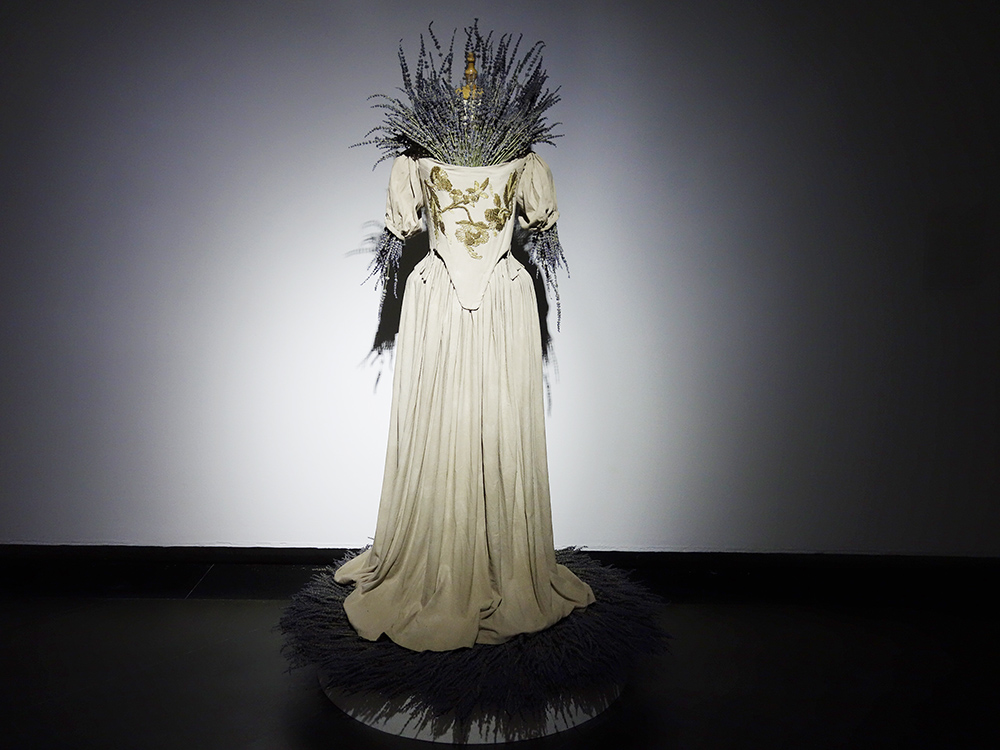 达米特里带来的另一件展品是一条 1665 年时期风格的“病原之裙”。裙子采用生丝为原料,同时用胡桃皮进行手工染色,因为当时最有名的草药师尼古拉斯·库尔佩珀(Nicholas Culpeper)曾推荐胡桃作为治疗瘟疫的方法。裙身装饰有典型 17 世纪风格的刺绣,刺绣上浸了艺术家从灭活瘟疫细菌中提取的 DNA。长裙上还部分点缀了薰衣草花束——在历史上的伦敦大瘟疫时期,人们常会携带嗅闻薰衣草,以遮掩疫病所散发的臭味,也起到防止疾病污染的作用。这条裙子的裙衬(一片通常穿在裙子里好让裙子蓬起来的衬垫)里塞进了气味刺鼻的草药和香料混合物,和当时治疗瘟疫的医生所佩戴的鹰嘴形口罩里填充的一样。