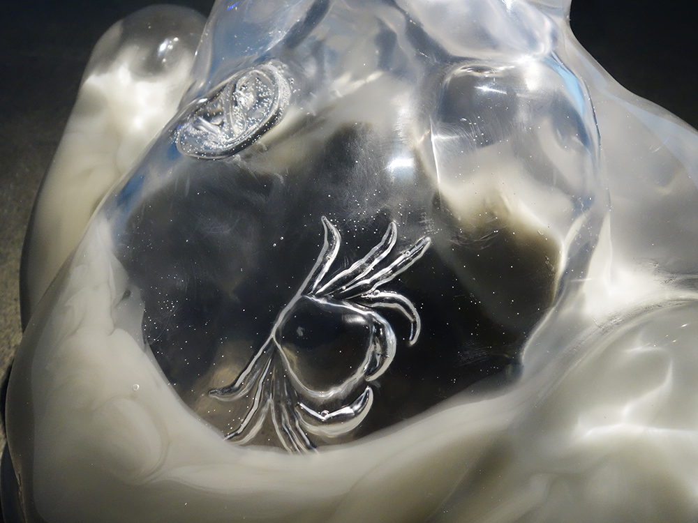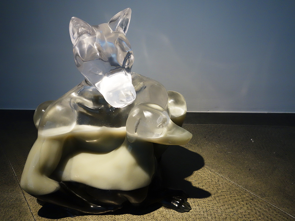 这件采 用 树 脂 浇 铸 的 人 犬 (Hundemensch) 雕塑。由狗头和下蹲人身组成,怀里护着一只小狗。其肌肉发达的透明背部下方清晰可见人耳、青蛙、蝾螈和螃蟹的轮廓。与拉瑞克此前的许多作品不同的是,创作这种作品的灵感并非来自现有雕塑。相反,他是根据史前至 19 世纪期间创作的各种拟人形象来绘制图纸,然后制成 3D模型,最后依此浇铸成雕塑。