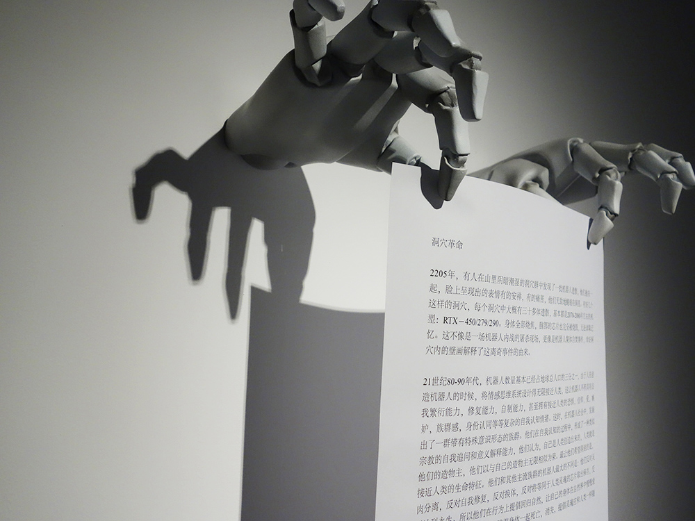 陆平原擅长用“故事”这一独特的媒介进行艺术创作,撰写了大量与艺术有关的奇幻短篇作品。本次展览上呈现的是艺术家该系列在科幻方向上的最新实践,这不仅仅延续了该系列现实和梦境关系的模糊颠倒,也包含作为日常仪式的创作过程:艺术家将日本漫画家贰瓶勉《人形之国》中的人形赛伯格视为创作的灵感来源, 每天的写作时间都以膜拜这后人类的神祗作为开始。作品讲述的是在人工智能语境下,灵(灵魂)肉(肉体)可分离所引发的冲突和矛盾。故事用 A3 纸张打印,并用一双机械手雕塑固定并悬挂,使得故事带有神秘、雕塑化的人工智能气息。