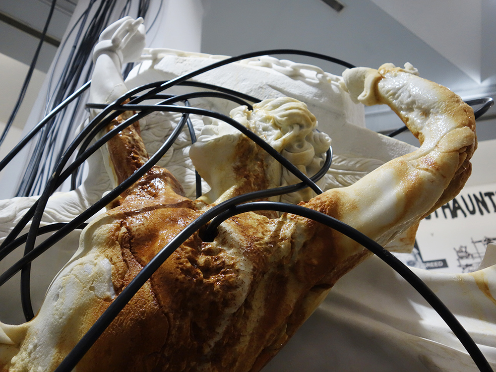 作品的中央矗立着一尊《被缚的普罗米修斯》大理石雕塑。这尊雕塑正在被自养型细菌缓慢吞噬。无机的石头变成了有机的“食物”。