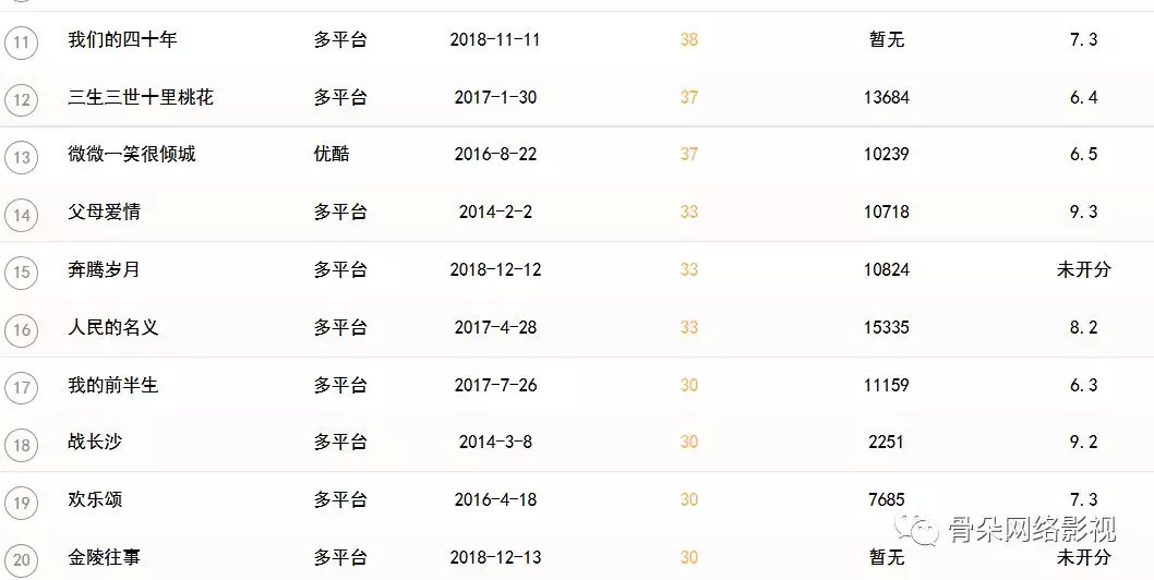有趣的是,《大江大河》的热播带动了导演孔笙的其他作品热度“回流”,《父母爱情》《战长沙》《欢乐颂》等剧集开始出现在骨朵热度榜中,不少媒体也会打趣地表示《大江大河》只是孔笙众多高分作品里还不错的一部。