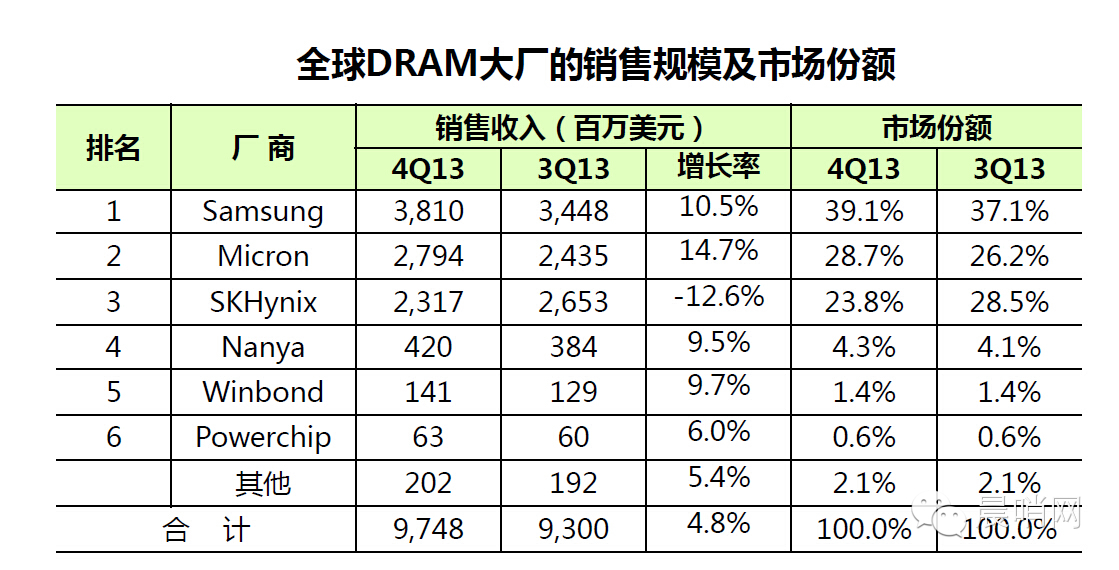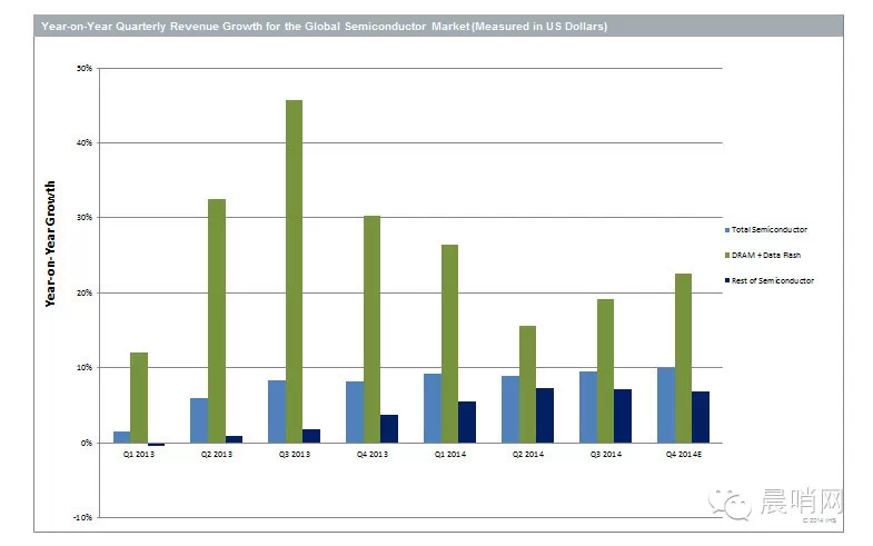 根 据美国市场调查公司IHS发布的调查报告显示,在半导体行业的28个细分领域中,存储器市场的表现最为出色。2013年DRAM和闪存实现了30%以上的 增长,其他半导体产品的增长率只有1.5%左右。2014年DRAM和闪存依然表现出色,预计市场将扩大约20%,而其他半导体产品也将实现6.7%的增 长。