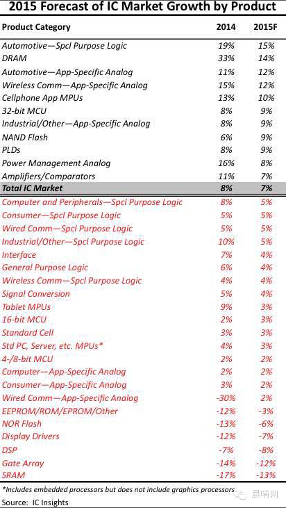而根据IC insights对33个半导体分类产品15年全球增速预测,汽车类电子,DRAM,无线通讯基带,MCU等排前列。