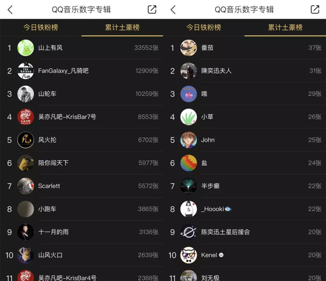 但数字专辑销量高未必代表受众基数大。根据平台显示的粉丝购买情况来看,流量型歌手头部消费粉丝人均购买专辑近万张,而陈奕迅的榜首粉丝才消费了37张。这就导致数字音乐销量榜实则是粉丝金钱榜,与音乐品质强弱并无明显关系。