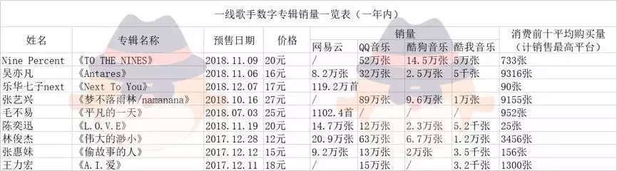 根据列表可见,nine percent新专辑《TO THE NINES》上线一个月后销量共计70万张,张艺兴征战北美的专辑《梦不落雨林/namanana》上线两月销量直逼百万。与之相比,华语乐坛中流抵住张惠妹和陈奕迅的销量情况就略为惨淡。