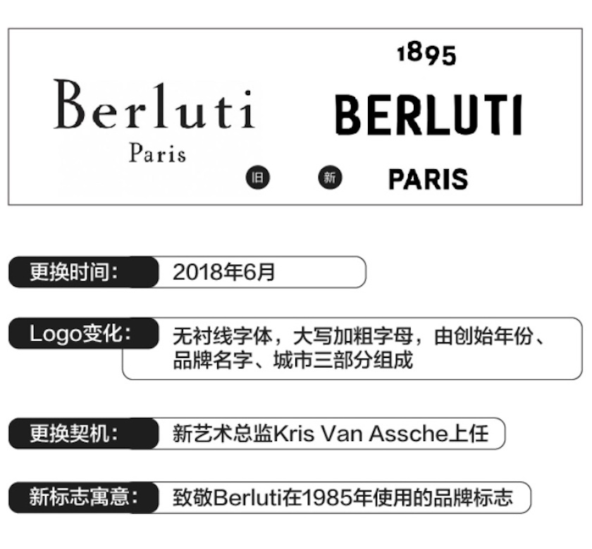 新Logo的字体同其他更换Logo的奢侈品牌一样采用了全新的无衬线字体,为了更加符合当下的流行趋势还将字母全部改为大写加粗,并以更加简约的方式在Logo中呈现了品牌的创始年份、品牌名字以及诞生城市三个部分,由Berluti Paris Bottier depuis 1895”变为了“1895 Berluti Paris”。
