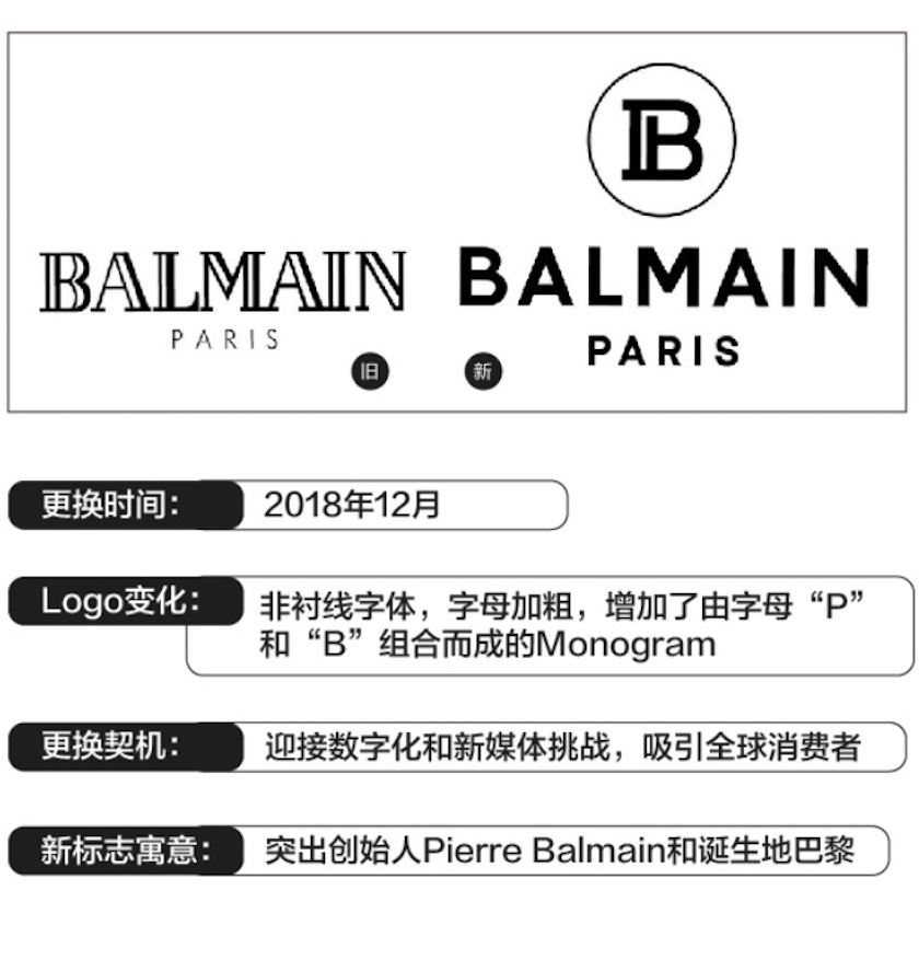 于12月初更换了新Logo的法国奢侈品牌Balmain赶上了2018年Logo热潮的末班车。这也是该品牌创立80年以来对其Logo的首次更新。