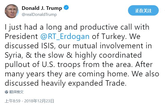 周日,特朗普与埃尔多安再度就叙利亚撤军通话。特朗普在Twitter上称两人就“缓慢且高度协同的美军撤出”进行了讨论,同时还谈到了“大力加强”两国贸易往来。