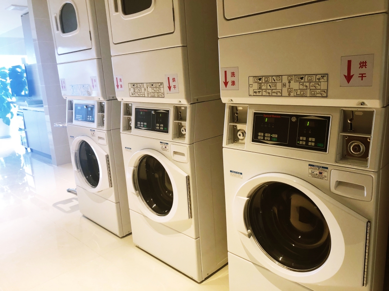 成都凯悦嘉寓酒店针对长住客人,专门在17楼设立了一个自助洗衣房,分别有三台洗衣机和烘干机。洗衣服变成了投几个硬币的事情,方便得很。