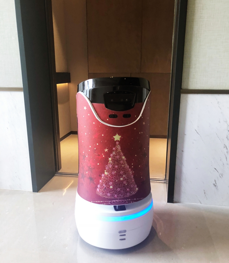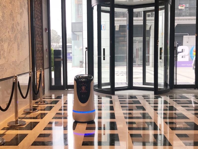 一走进酒店,首先看到的不是酒店工作人员,而是一个机器人。它叫宝宝,可以迎接宾客,为宾客指路,还能提供送餐和送生活物件的服务。很多人纳闷,机器人送东西,怎么按门铃提醒房客开门呢?事实上,机器人宝宝到达房客门口时,会自动拨出房间的电话提醒房客开门。