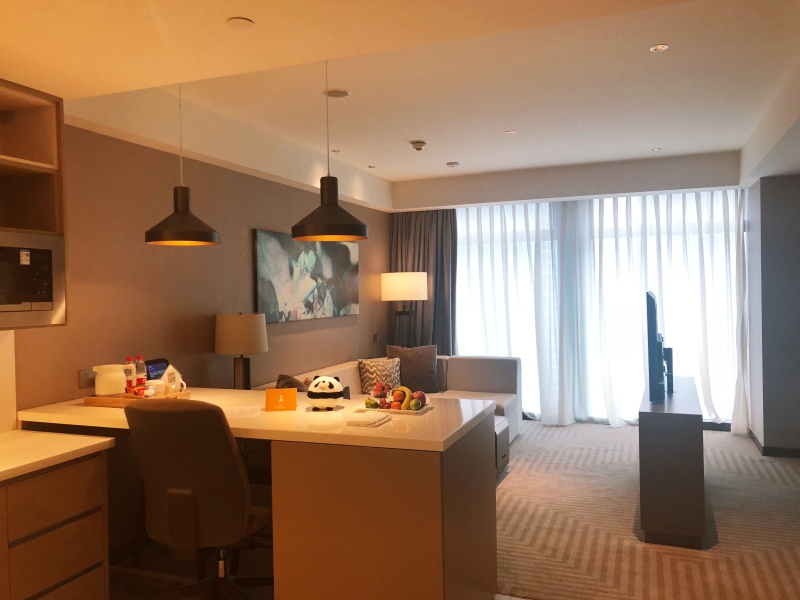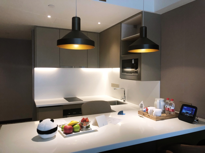 说完大堂,再来看看最主要的客房区域。我入住的是凯悦嘉寓酒店,一走进房间,就发现这是典型的酒店式公寓设计,首先看到的是一个开放式厨房和会客厅。