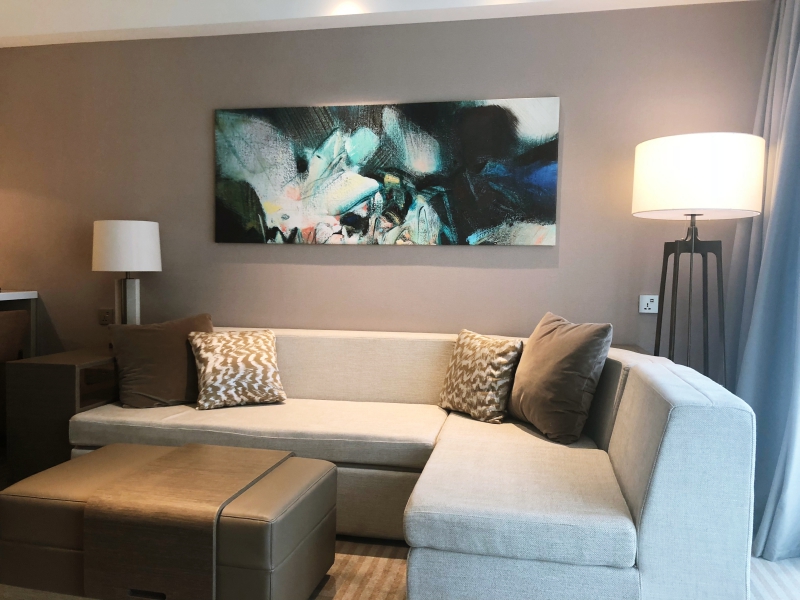 会客室的L型沙发是凯悦嘉寓酒店的特色之一。沙发的功能性很强,平时可以在这里开会、聊天。到了晚上,把沙发下面那层拉开,立马变成一张沙发床,每个房间还专门配备了一整套床上用品,服务周到。