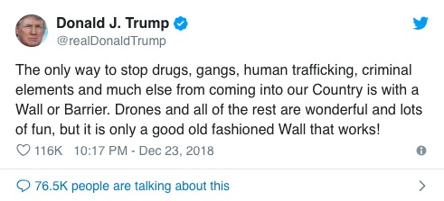 周日上午,特朗普发推特称:“唯一能够避免毒品、黑帮、人口贩卖和其他犯罪因素流入美国的唯一方法就是建立隔离墙或栅栏。”在美国和墨西哥边境上修建围墙,防止移民非法进入美国是特朗普参加总统竞选时的重要内容,他还是誓言将让墨西哥承担全部费用。