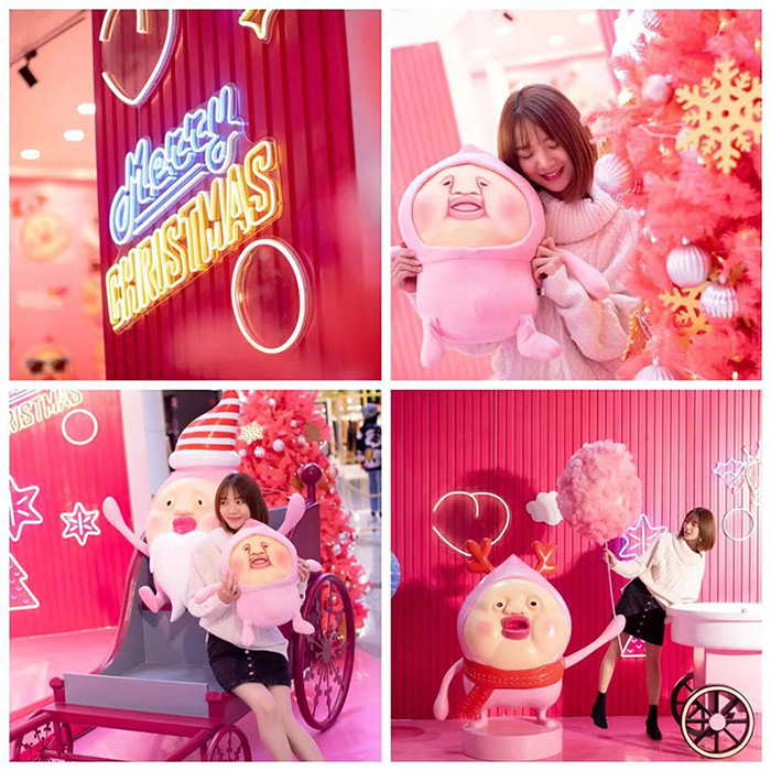 现场有爱心大泳圈、天鹅泡泡圈、彩虹、雪糕还有超会卖萌的屁桃君。细心地游客会发现,现场有一个留着又长又雪白的大胡子的“假扮”圣诞老伯伯的粉屁桃,似乎是要和圣诞老伯伯抢工作呢~拉着一辆圣诞小车赶来,不知圣诞当天这车上会不会装满圣诞礼物,把幸运带给我们呢?