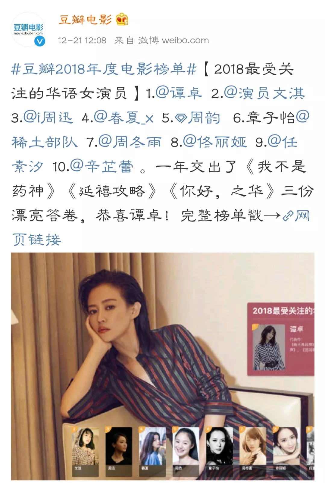 前几天豆瓣公布的2018最受关注华语女演员名单,谭卓高居榜首。
