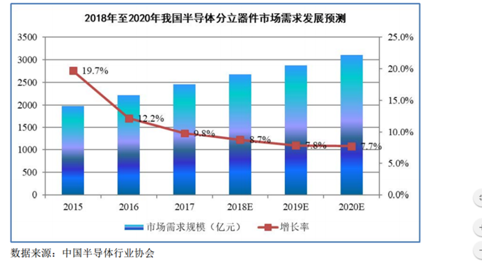 根据招股书,目前分立器件行业规模以上企业主营业务收入占半导体行业规模以上企业主营业务收入的22%-25%,2017 年我国半导体分立器件市场规模已达到2473.9亿元。