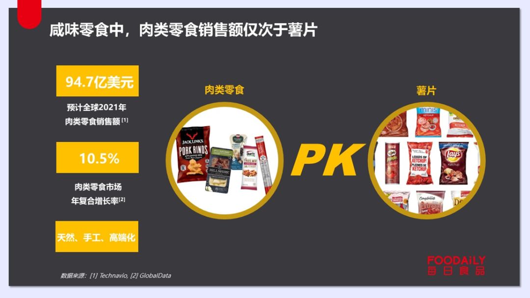 (1)洞察全球:肉类零食势头迅猛、作为休闲零食更是可与薯片类相媲美