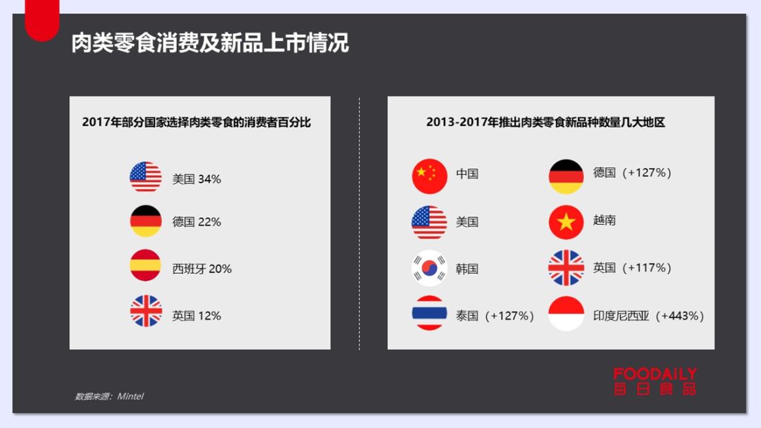 2017年部分国家选择肉类零食的消费者百分比为:美国34%、德国22%、西班牙20%、英国12%;2013-2017年推出肉类零食新品种数量的几大地区分别为:中国、美国、韩国、泰国(+127%)、德国(+127%)、越南、英国(+117%)、印度尼西亚(+443%)。