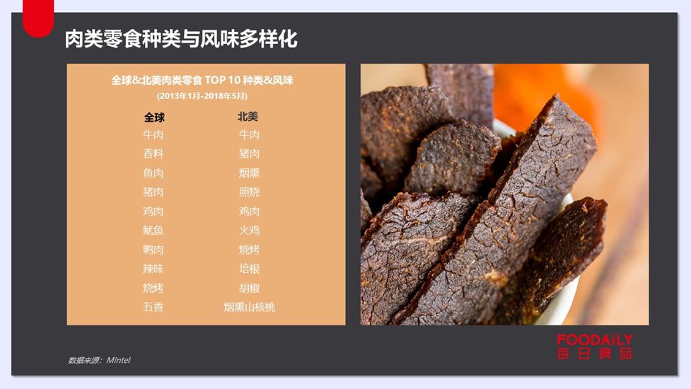 风味上,2013年1月-2018年5月全球肉类零食前十大风味:牛肉、香料、鱼肉、猪肉、鸡肉、鱿鱼、鸭肉、辣、烧烤、五香粉;2013年1月-2018年5月北美地区肉类零食前十大风味味:牛肉、猪肉、烟熏、照烧、鸡肉、火鸡、烧烤、培根、胡椒、烟熏山核桃。
