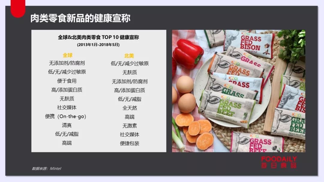 Mintel数据显示,2017年全球30%的肉类零食营销定位于某一健康领域。2013年1月-2018年5月全球肉类零食前十大使用宣称分别是:无添加剂/防腐剂、低/无/减少过敏原、便于使用、高/添加蛋白质、无麸质、社交媒体、便携(On-the-go)、清真、低/无/减脂、高端。相应地,北美地区则为:低/无/减少过敏原、无麸质、无添加剂/防腐剂、高/添加蛋白质、低/无/减脂、全天然、高端、无激素、社交媒体、便捷包装。