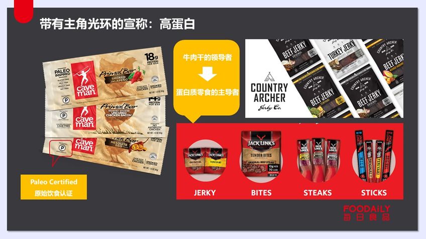 很多品牌因“高蛋白”宣称趋势积极做出改变,例如创立于1977年的美国肉干品牌Country Archer将其广告语改为“Your new favorite protein bar”。美国肉类零食品牌Caveman食品在其包装上突出特殊饮食的标注,其产品系列Primal肉类零食棒及Chomps的新包装中便添加上了原始人饮食、Whole30膳食计划的标志。新西兰品牌Jack Link首席营销官则表示:Jack Link已宣布要从“牛肉干的领导者”向“蛋白质零食的主导者”转变。