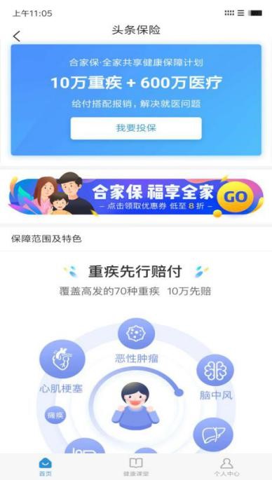 “保险”板块打开后的页面上方显示为“头条保险”,目前为一款“合家保·全家共享健康保障计划”,即10万重疾+600万医疗保障的组合,由泰康在线承保。