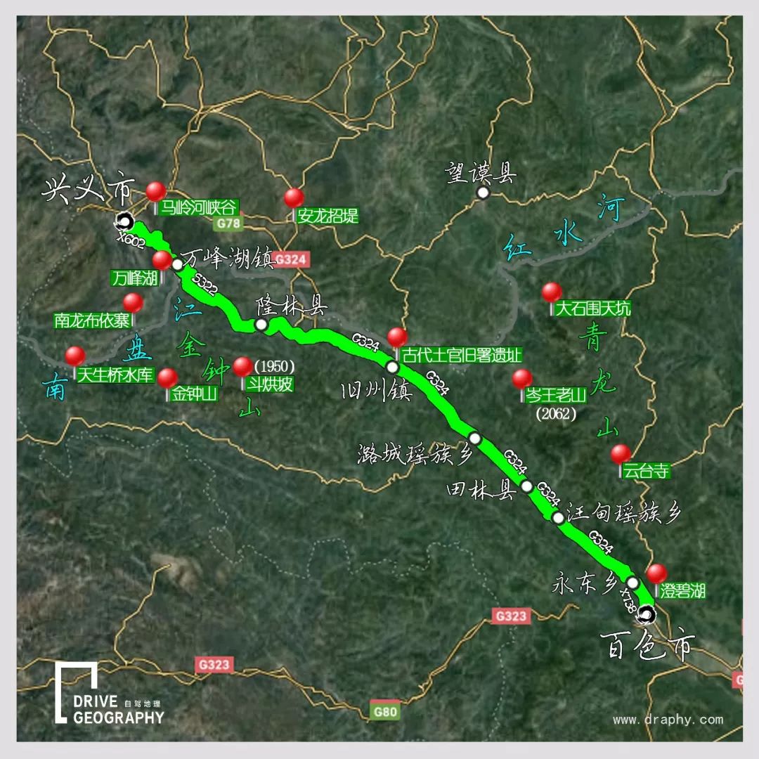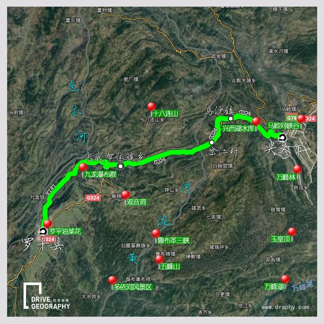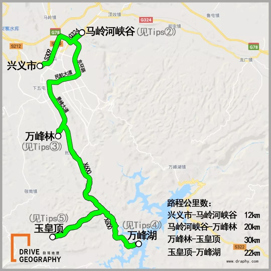 兴义至万峰湖镇为低等级盘山县道,全程在山区间蜿蜒穿行,急弯较多,注意车速。