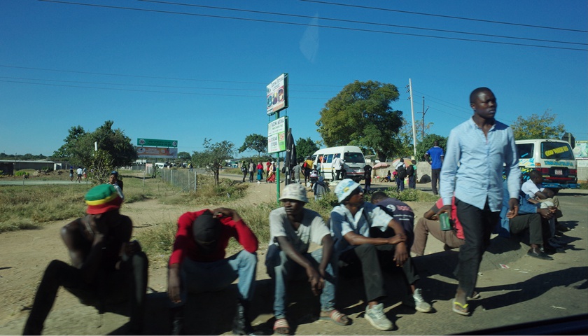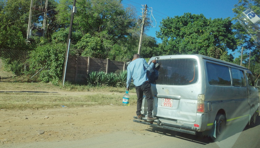 在哈拉雷的路上,看不到类似公共汽车的公共交通工具,当地人出行除了开车、走路之外还有一种私人运营的面包车充当公交。时不时能看见站着挂在面包车后面,“搭便车”的年轻人。