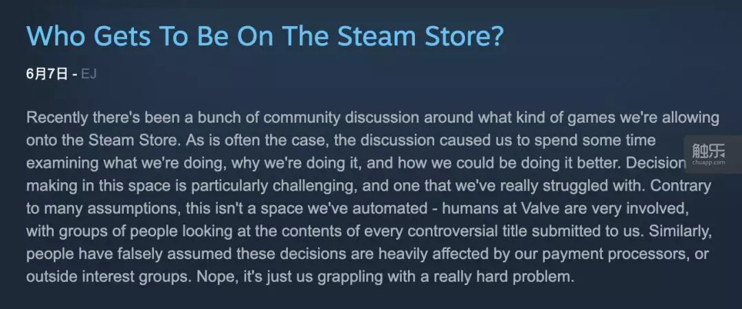 更有意思的是,V社在一个月之后发布了一则新的声明,称他们将推出一个新的筛选机制,有成人内容的游戏开发者需要对Steam进行说明,除此之外,任何不违法、不抄袭的游戏都可以顺利上架。无独有偶,在6月中旬的俄罗斯圣彼得堡White Nights游戏大会上,V社的法务主管表示“我们不是口味警察”(We are not the taste police),再次强调他们不会根据内容来判断或者删除游戏。