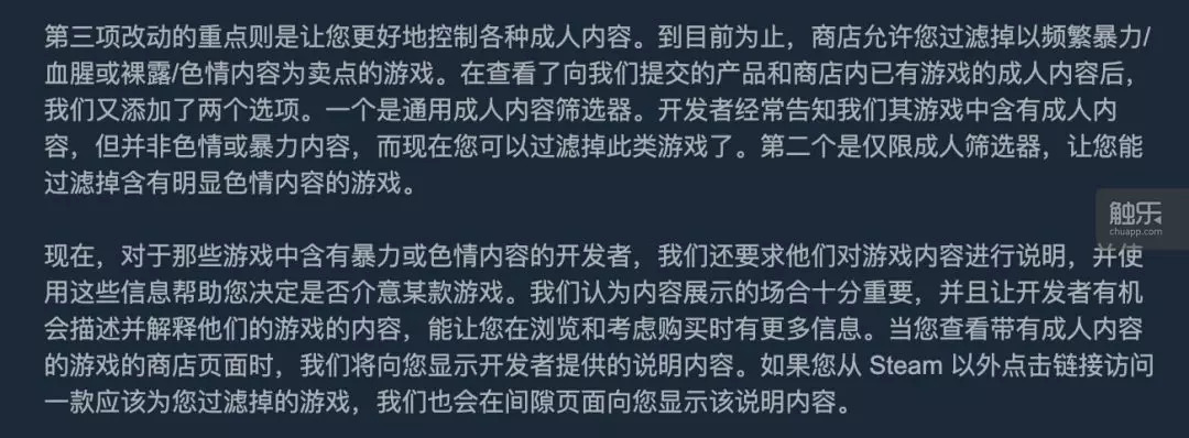 9月,V社又公布了“最新进展”,增加了两个关于成人内容的筛选选项:面向一般作品的“通用成人内容筛选器”和针对以成人内容为卖点作品的“仅限成人筛选器”。此外,游戏中含有暴力或色情内容的开发者必须对游戏内容进行说明,当玩家查看某个游戏的Steam页面,或是从外部链接访问某个游戏时,这些说明就会显示出来。