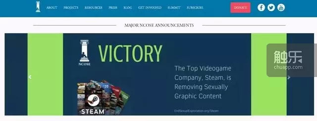5月,在成人游戏开发商们收到V社邮件警告之后,NCOSE官方网站上打出了“胜利”字样