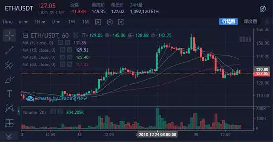 随后又是一轮下跌。截至12月25日19:00,以太坊已跌至127.22美元,累计跌幅近20%。