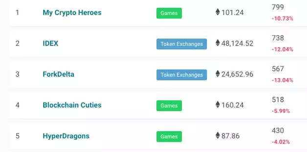 以太坊平台Top 5 Dapp日活用户数均不足1000