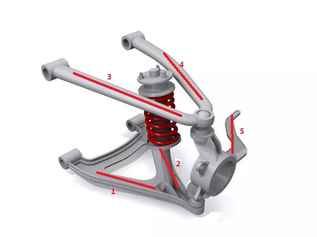 这类悬挂采用上下两个A形臂。一个A形臂能限制2个自由度,因此我们还需要一根额外的控制臂控制余下的1个自由度。