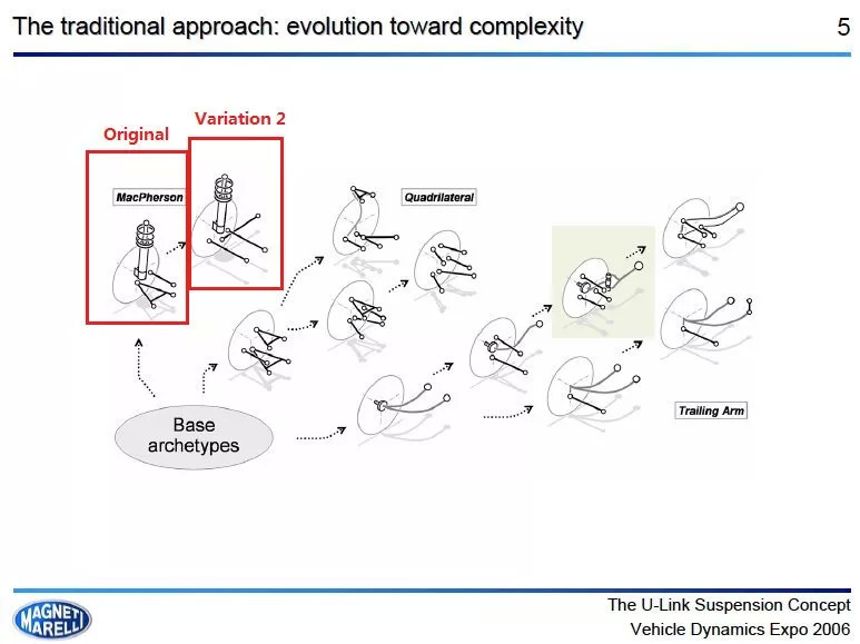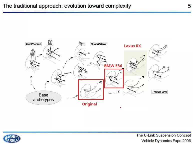 下图中,标记“Original”的就是麦弗逊初始版本。当然它有许多变种。比如你可以将下摆臂分解成两个控制臂,这在宝马和奔驰的一些低端车型上比较常见,像E90 3系(宝马称之为双枢轴)和C/E级(奔驰叫它三连杆)。