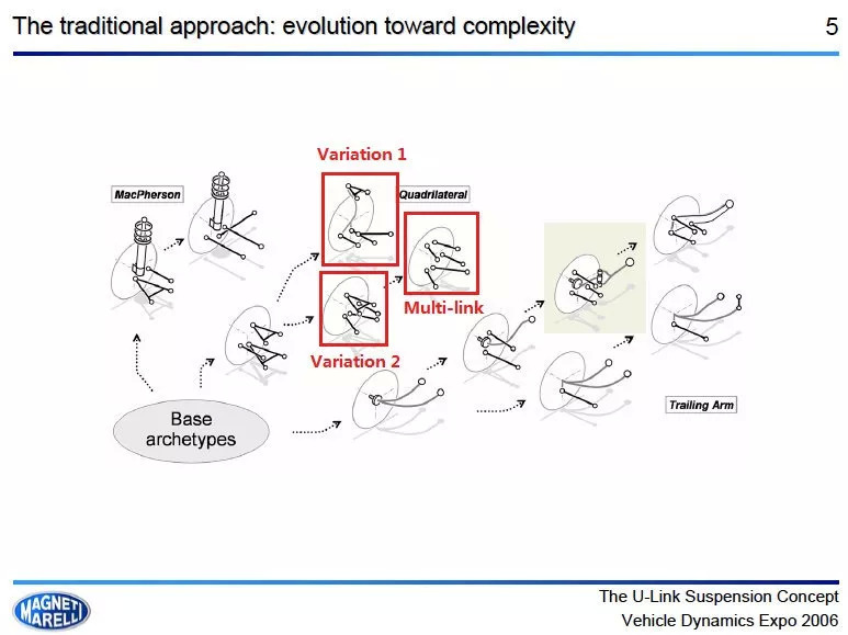 最初的拖拽臂悬挂只有一个单臂,它的变种就不一样了。所有变种都有一个相似的改动:从单臂上释放几个自由度,转移到新增的控制臂上。通过增加更多的控制臂,悬挂性能会有所提升。