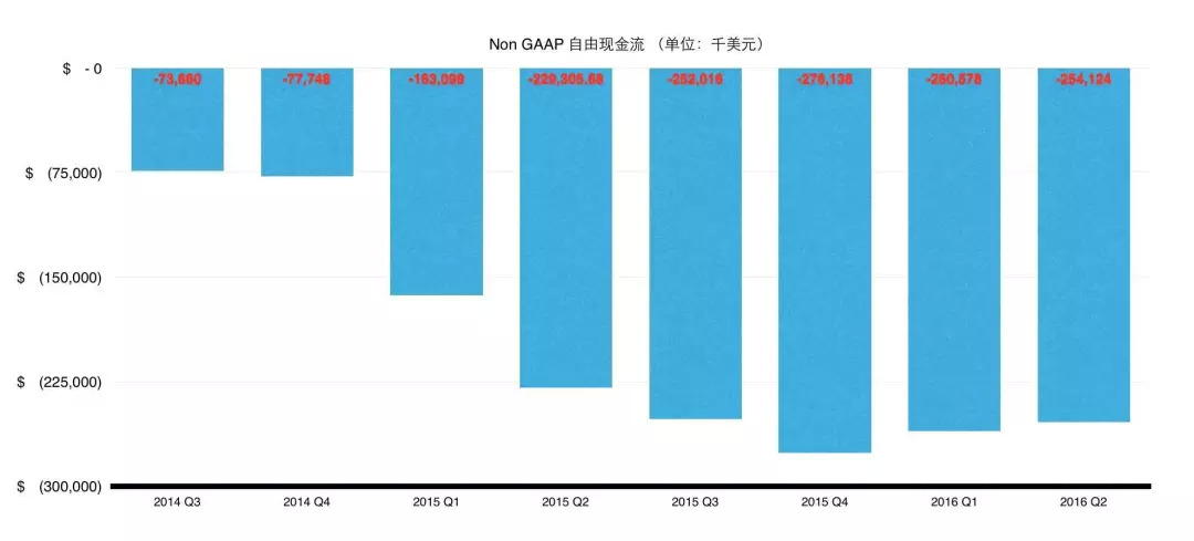 Netflix自2014年Q3至2016年Q6的现金流负值