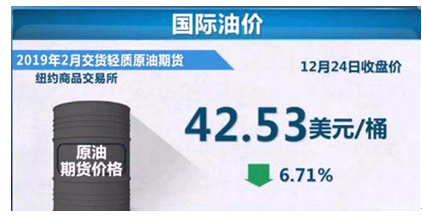美股大跌引发连锁反应,市场担忧全球经济增长放缓及供应过剩,国际油价24日大幅下跌。纽约商品交易所2019年2月交货的轻质原油期货价格下跌6.71%,收于每桶42.53美元。这是自2017年6月以来纽约油价首次跌破43美元。自今年10月份冲高突破76美元以来纽约油价已经下跌超过44%。
