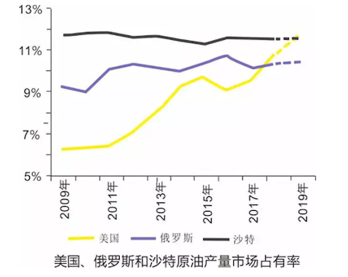 美国经过2011年和2017年两次页岩油革命,原油产量快速上升,预计2019年,年度原油产量占比将达到11.7%,势必增加供应过剩压力。另一方面,沙特与俄罗斯牵头达成的减产协议旨在平衡市场,但考虑到俄罗斯和部分豁免国减产执行力不强,减产协议对油价的实际提振作用有限。