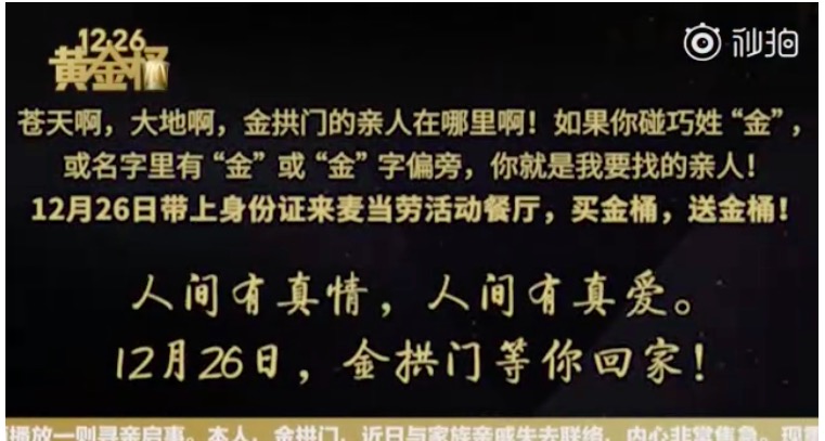 为此麦当劳还专门制作了一支《1226黄金桶》视频:“金桶在你身边,金桶因你而动。近日来,北京、上海、南京、武汉等城市报纸上的一张特殊寻亲启示引发了全社会高度关注……经本台记者了解,原来这都是为了推广全新产品金拱门桶。”“本台将持续为您播报金拱门桶的第一手资讯。”