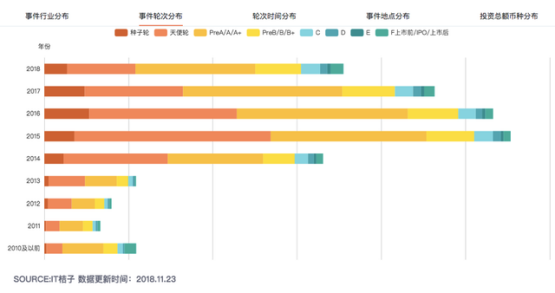 作为相对好融资的互联网行业来说,创业公司也迎来了倒闭潮。据IT桔子互联网获投创业项目数据,经过2015年、2016年、2017年这三年的爆发式增长后,2018年融资事件和金额出现下滑。今年创业公司新增融资截止11月23日,共7131起,相比去年同比下降23%;获投的风险投资资金总额出现2013年以来首次下滑。