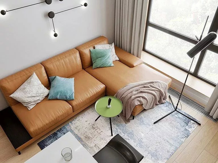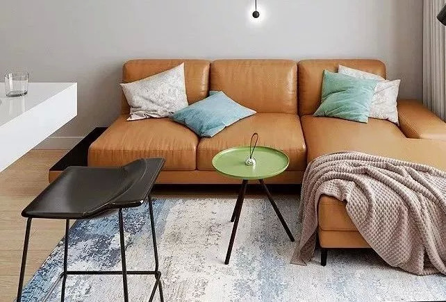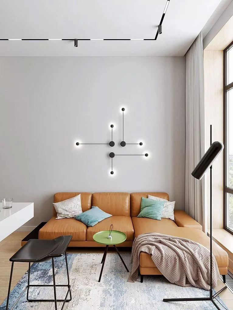房子的特点在于,面积不大,楼层却很高,视觉上让空间看起来很宽敞,并没有拥挤的感觉。大面积的落地窗保证了客厅的采光,橘色皮质沙发,给整个空间增质不少。