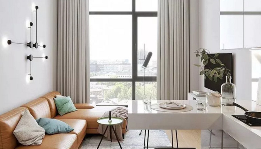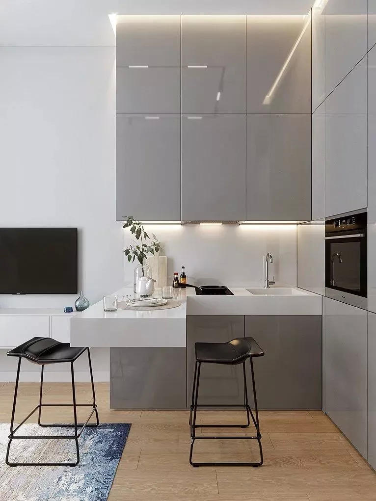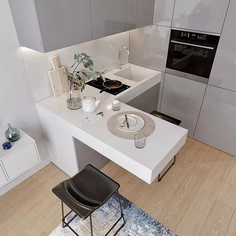 由于空间有限,餐厨就在客厅旁边,并且是一体式,没有单独的餐厅和厨房。各种操作设备都齐全,小小的吧台,兼具多种功能,让这个小空间精致又实用。