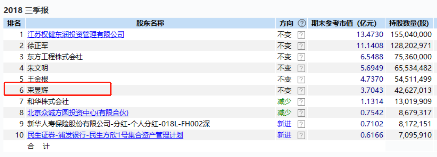 启信宝显示,江苏权健东润投资管理有限公司的法人代表、董事长为朱文明,是金财互联的实控人。根据金财互联2018年三季报显示,朱文明、束昱辉为一致行动人,两人对金财互联持股比例已达33.38%。