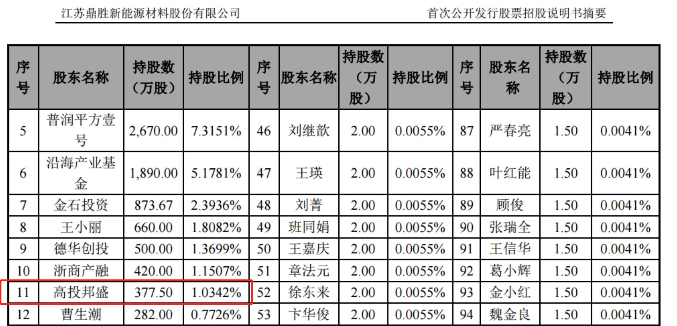 2018年4月18日才挂牌的鼎胜新材(603876.SH)招股书显示,高投邦盛是鼎胜新材第11大股东。2015年12月,高投邦盛以2661.38万元人购入鼎胜新材377.50万股。