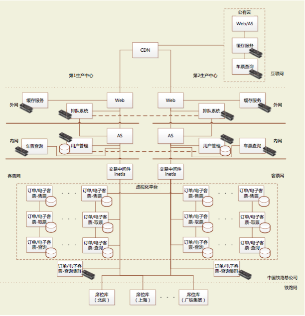 同时,12306互联网售票系统采用虚拟化技术实现了一中心和二中心的双活架构,两个中心采取相同的部署,互为备份,各自拥有独立的Web、AS、排队系统、缓存服务集群、车票查询集群、用户数据集群、交易中间件和电子客票库。正常情况下双中心同时在线提供服务,其中任意一个中心发生故障时可由另外一个中心承载全部的售票业务。